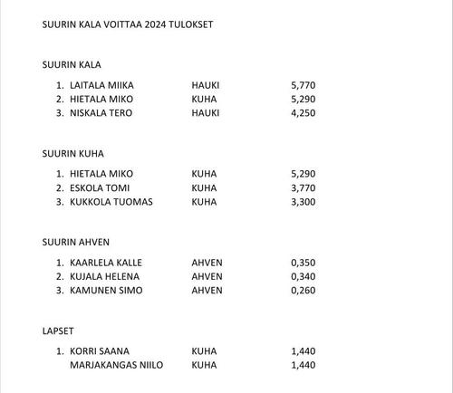 Suurin kala -kisan voitti Miika Laitala reilun 5,7 kg:n hauellaan. Suurimman kuhan pyydysti Miko Hietala, jonka kala painoi 5,3 kg. Suurimman ahvenen 350 g sai Kalle Kaarlela.